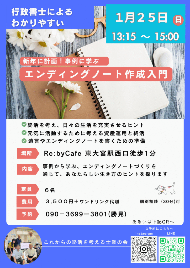 1月25日(日)午後、東大宮駅西口すぐの人気ブックカフェ、Re:byCafeさんにて、エンディングノート作成セミナーを行います。今回は事例を用いて学ぶことで、終活にも様々なパターンがあることを知って、あなたらしい生き方のヒントを見つけるというテーマで実施します。日曜日開催です!定員6名になりますので、お早目にご連絡下さい。